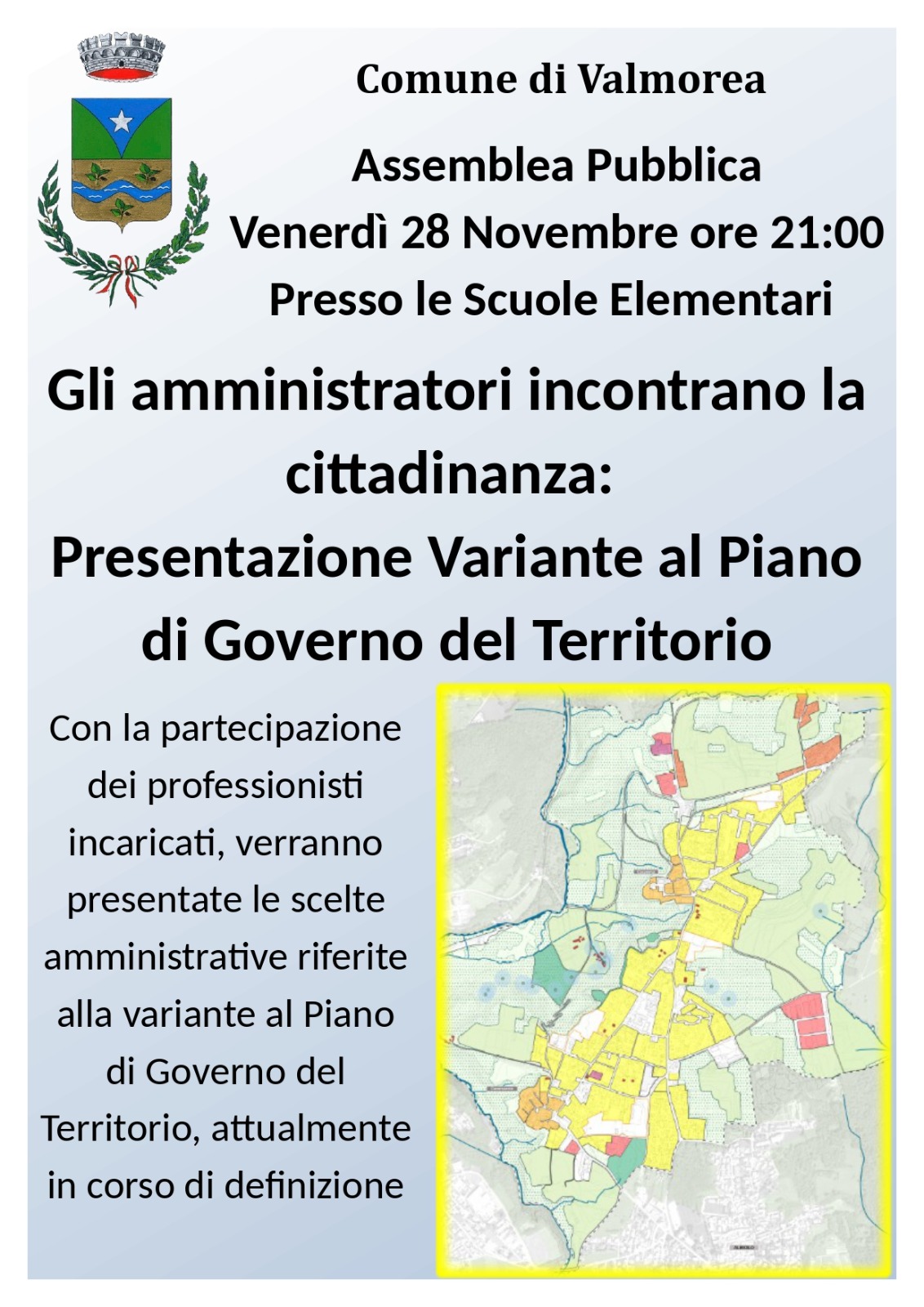 Venerdì 28 novembre 2025, alle ore 21.00, presso le Scuole Elementari di Valmorea si terrà un'ASSEMBLEA PUBBLICA, durante la quale gli amministratori comunali e i professionisti incaricati presenteranno alla cittadinanza le scelte riferite alla variante al Piano di Governo del Territorio, attualmente in corso di definzione.
