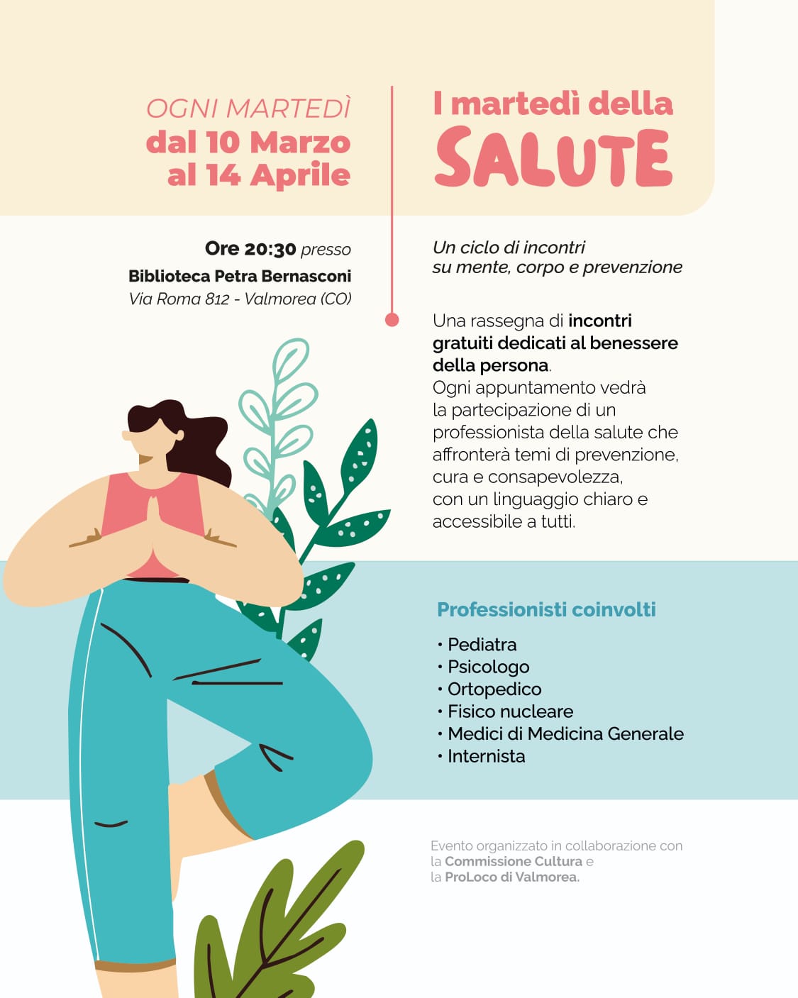 La Commissione Cultura del Comune di Valmorea, in collaborazione con la Pro Loco di Valmorea, organizza “I Martedì della Salute”, un ciclo di incontri dedicati a mente, corpo e prevenzione.